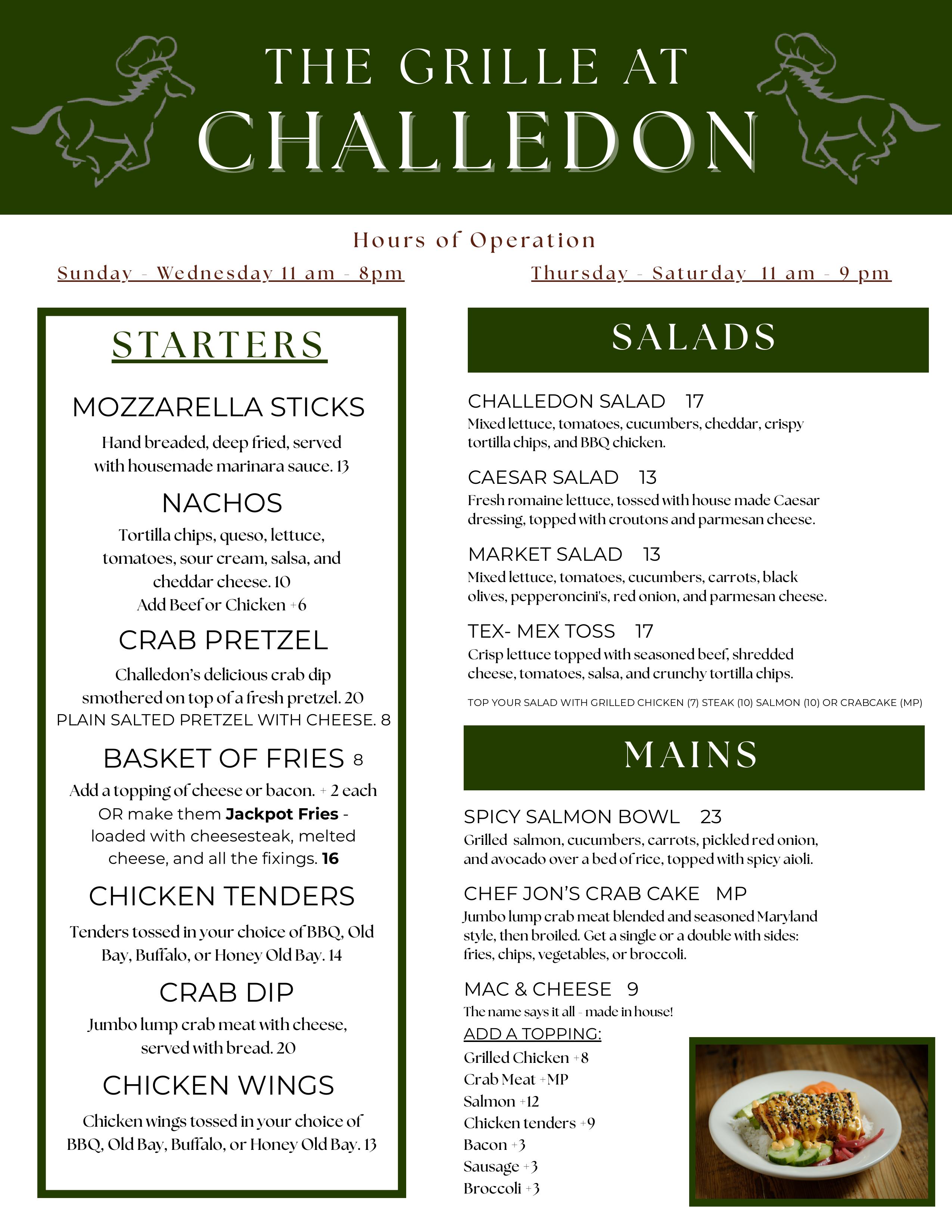 The Grille at Challedon offers golfers and non-golfers alike the chance to enjoy a great meal and great views of our 18th hole. The family-friendly environment offers traditional, American-style cuisine with a variety of options for all palates.